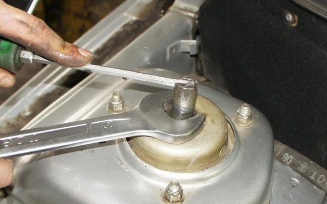 Ослабьте гайку верхнего крепления штока амортизатора специальным ключом