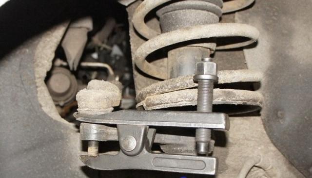 Промаркируйте положение эксцентрика (верхний болт) относительно скобы стойки (делается в том случае, если после замены амортизаторов не будет произведен развал схождения колес)