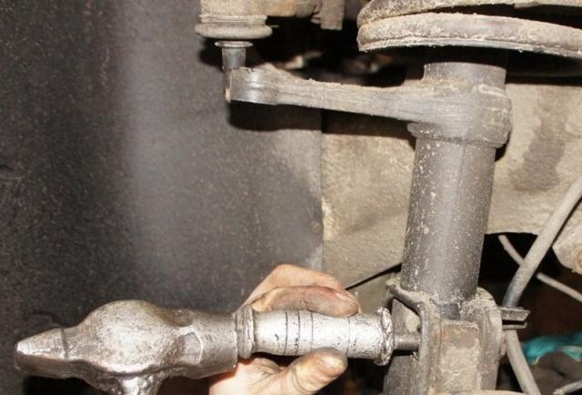 Теперь надо вынуть палец рулевого наконечника из крепления на стойке, сделать это можно либо специальным съемником, либо, немного накрутив гайку на палец наконечника, аккуратно выбить его молотком. Потом вынимаем тормозной шланг из крепления на амортизаторе