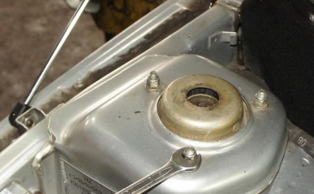 Отворачиваем гайки крепления амортизатора к стакану кузова автомобиля. Производим установку в обратном порядке.