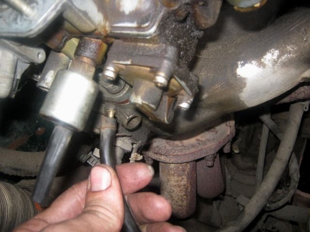 3) После проделанных операций, продолжаем отсоединять шланги, ещё Вам их в районе двух отсоединить будет нужно, первый шланг это шланг вентиляции картерных газов малой ветви, он подсоединён к патрубку карбюратора и удерживается на нём исключительно за счёт плотной посадки (Т.е. Он без хомута идёт, поэтому его просто нужно сдёрнуть, более подробно на фото 1 смотрите), далее переходите ко второму шлангу, к шлангу подвода топлива, ослабьте его затяжку (Он хомутом крепится) и после чего отсоедините шланг от патрубка (см. фото 2) из шланга потечёт бензин, чтобы он не засорял движок и чтобы это всё не привело к пожару, заглушите отверстия патрубка чем ни будь (Болтом подходящего диаметра к примеру), после этого выверните в круг все четыре гайки которые карбюратор крепят (см. фото 3) и потянув за него вверх, снимите карбюратор с впускного коллектора автомобиля.