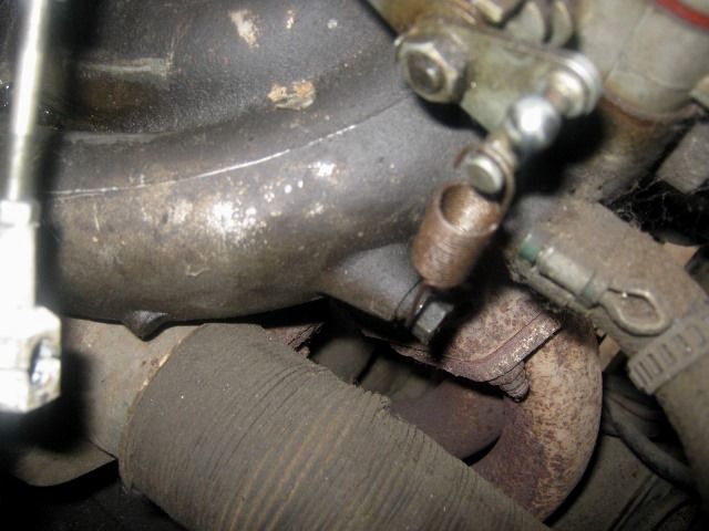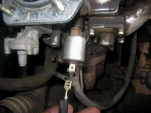2) Теперь переходите к отсоединению тяги от карбюратора (Цифрой 1 она указана на первом фото), она к нему крепится при помощи болта (Цифра 2) и винта (Цифра 3), их выкрутить будет нужно, не полностью конечно, а просто чуть ослабить достаточно будет и когда Вы с этим закончите, можете вынимать тягу (Трос по другому говоря) из отверстий в которые он входит, затем снимите возвратную пружинку пассатижами или рукой с рычага дроссельной заслонки первой камеры (Более подробно, смотрите на фото под номером 2), после чего отсоедините тягу дроссельных заслонок (см. фото 3, отсоединяется она не легко, но при помощи отвёртки её отсоединить будет проще простого, не сломайте главное её, а то новую тяги приобрести в автомагазине придётся) и отведите её в сторонку и в завершение, с клеммы электромагнитного клапана скиньте проводок который к ней подсоединяется (см. фото 4), а так же чуть ниже электромагнитного клапана к вакуумному корректору подсоединяется резиновый шланг (см. фото 4 он указан синей стрелкой), его тоже отсоедините.